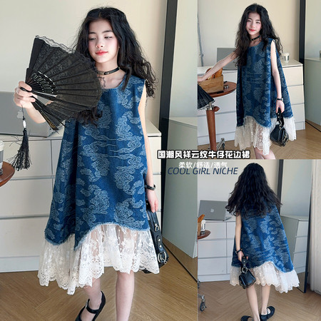 1*1收藏“8150-一国潮风祥云纹牛仔花边裙”